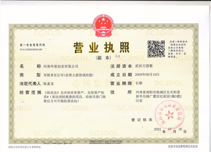 河南華星拍賣有限公司是經河南省商務廳批準,南陽市工商行政管理局依法注冊登記的綜合性拍賣機構。公司成立于2009年8月,注冊資金100萬元人民幣,經濟性質為有限責任公司,2013年7月取得由河南省財政廳頒發的“河南省公物拍賣資格證書”,F為河南省拍賣行業協會會員單位,中國拍賣行業協會會員單位,南陽市財政局中標單位,唐河縣財政局中標單位。南陽市農業銀行中標單位,鄧州市機關事務管理局中標單位、鎮平縣礦山修復廢礦產處置拍賣機構(唯一中標)。 本公司的業務范圍為:行政執法機關依法處理物品,充抵稅款的物品;審判機關依法處理的物品,充抵罰金、罰款的物品,無法返還的追回物品;檢察機關依法追回的物品;航運、郵政、公路等部門獲得的需處理的物品;金融部門需處理的借款抵押財產,保險公司理賠后需處理的損余物品;國家機關、事業單位和國有企業按有關規定需要處理的財產及需要變賣的公物;國家機關工作人員在公務交往和外事活動中接受的按規定需要交公處理的物品;其他方面需要處理的國有資產,如國有資源、房地產、設備、攤亭、營運線路的經營權,國有土地、吉利號碼的使用權,街道、路橋冠名權,新聞媒體和公用設施廣告的發布權等。公司現有國家注冊拍賣師4名,會計師1名,律師1名,具有拍賣從業資格的專職人員3名,具有業務人員數名。 本公司嚴格按照《拍賣法》的規定程序,規范運作,受到委托單位及競買人的充分肯定,為競買人及委托單位創造一個互惠互利、共同發展的良好平臺,贏得了社會的廣泛信譽。